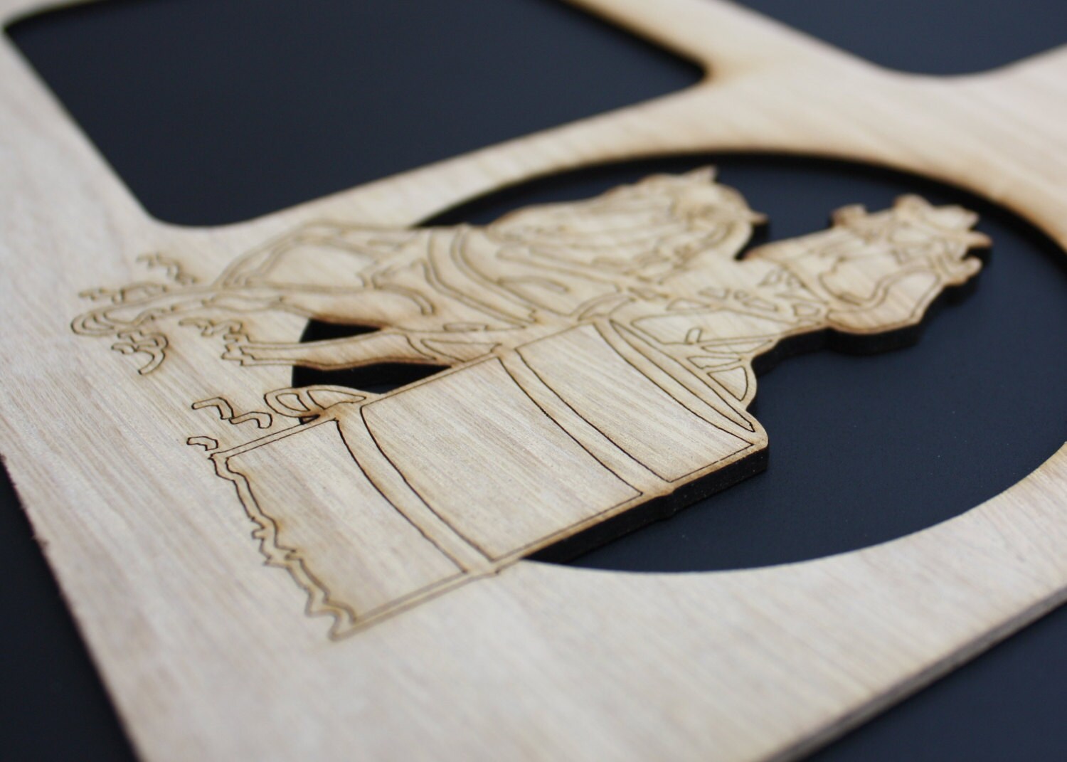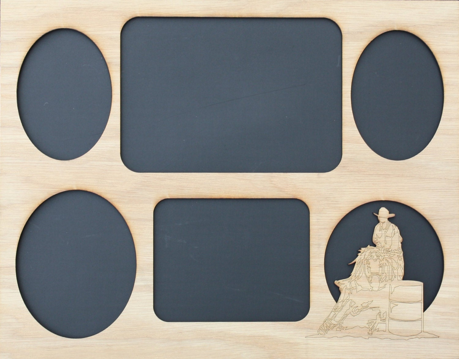 Slip this barrel racing mat into an 11 x 14 frame to display 5 of your best barrel racing photos. The wood mat is an oak veneer and is cut with a laser. The sizes of the openings are (in inches): 2 ovals @ 2-7/8 x 4, 1 oval @ 3-5/8 x 4-1/2, 1 @ 4-3/4 x 6-3/4, and 1 @ 3-3/4 x 4-3/4.