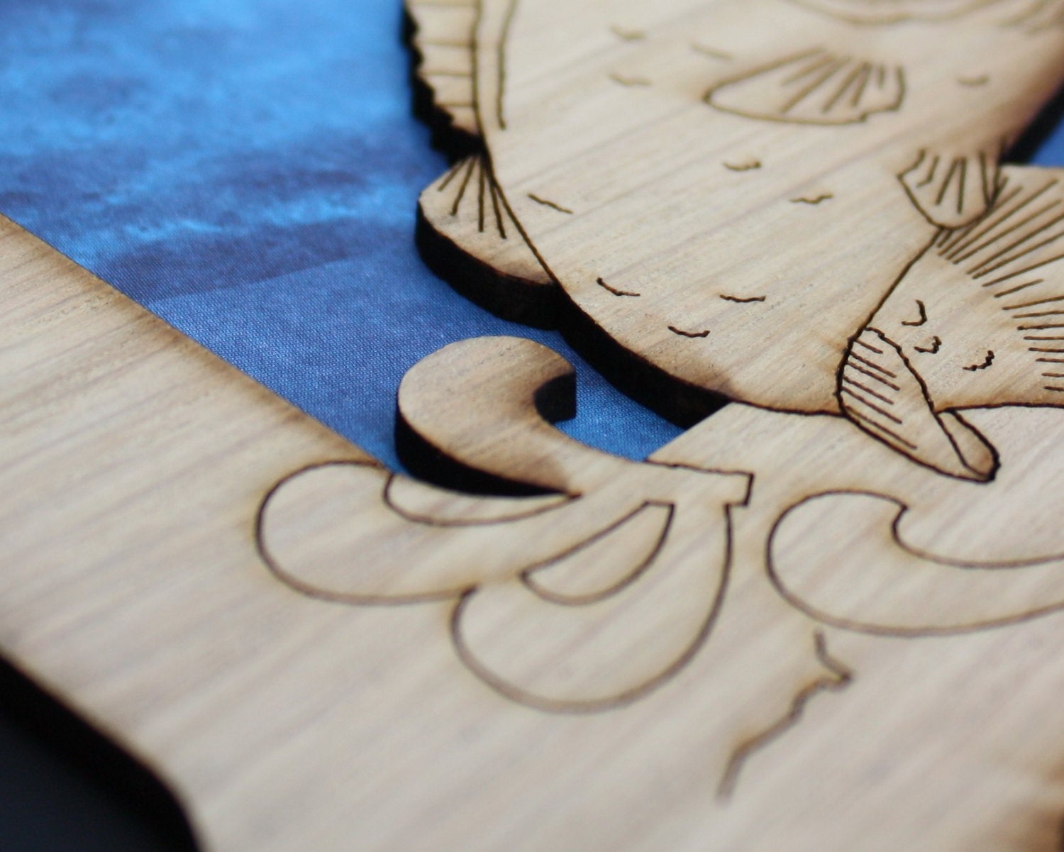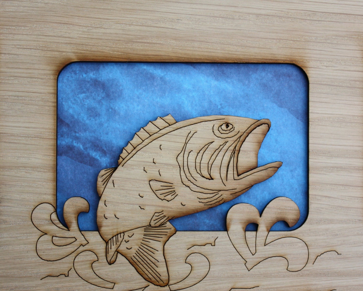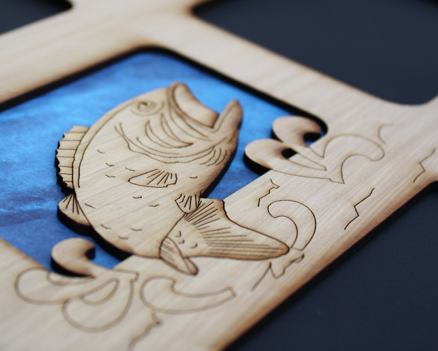 This bass fishing wood mat insert will fit into an 11x14 frame. It will hold 8 photos. The size of the openings are 4 ovals @ 3" x 4", 2 @ 2-1/2" x 3-3/4", and 2 @ 3-1/4" x 3-1/2". The thickness of the mat is 1/8".