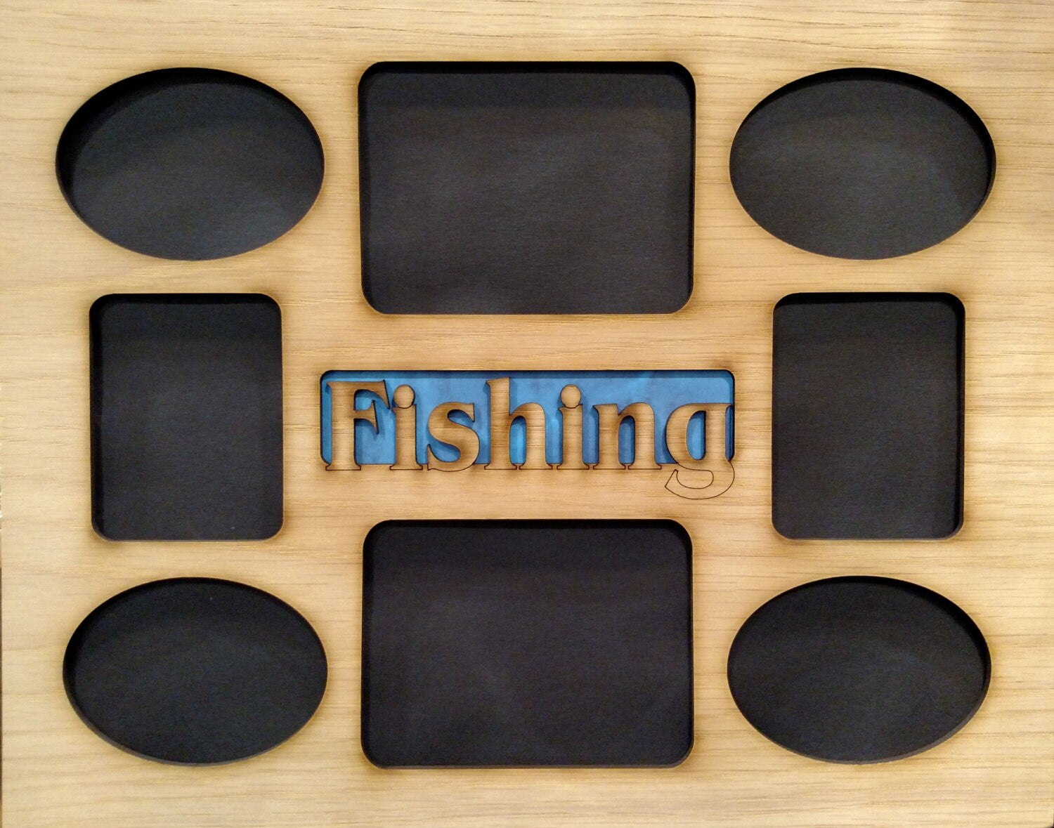 Slip this "Fishing" wood mat into an 11 x 14 frame and display 8 of your favorite fishing photos. The wood mat is an oak veneer and is cut with a laser. The sizes of the openings are (in inches): 4 @ 2 5/8” x 3 ¾”, 2 @ 2 5/8” x 3 ½”, and 2 @ 3 ½ “ x 4 5/8”. The mat is 1/8" thick.