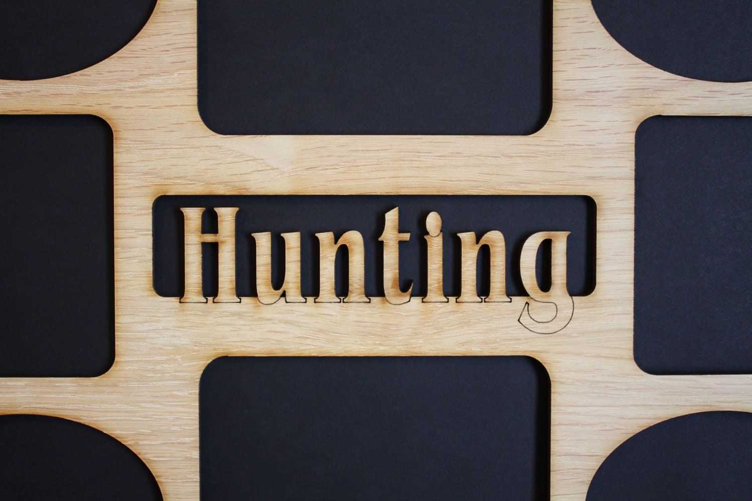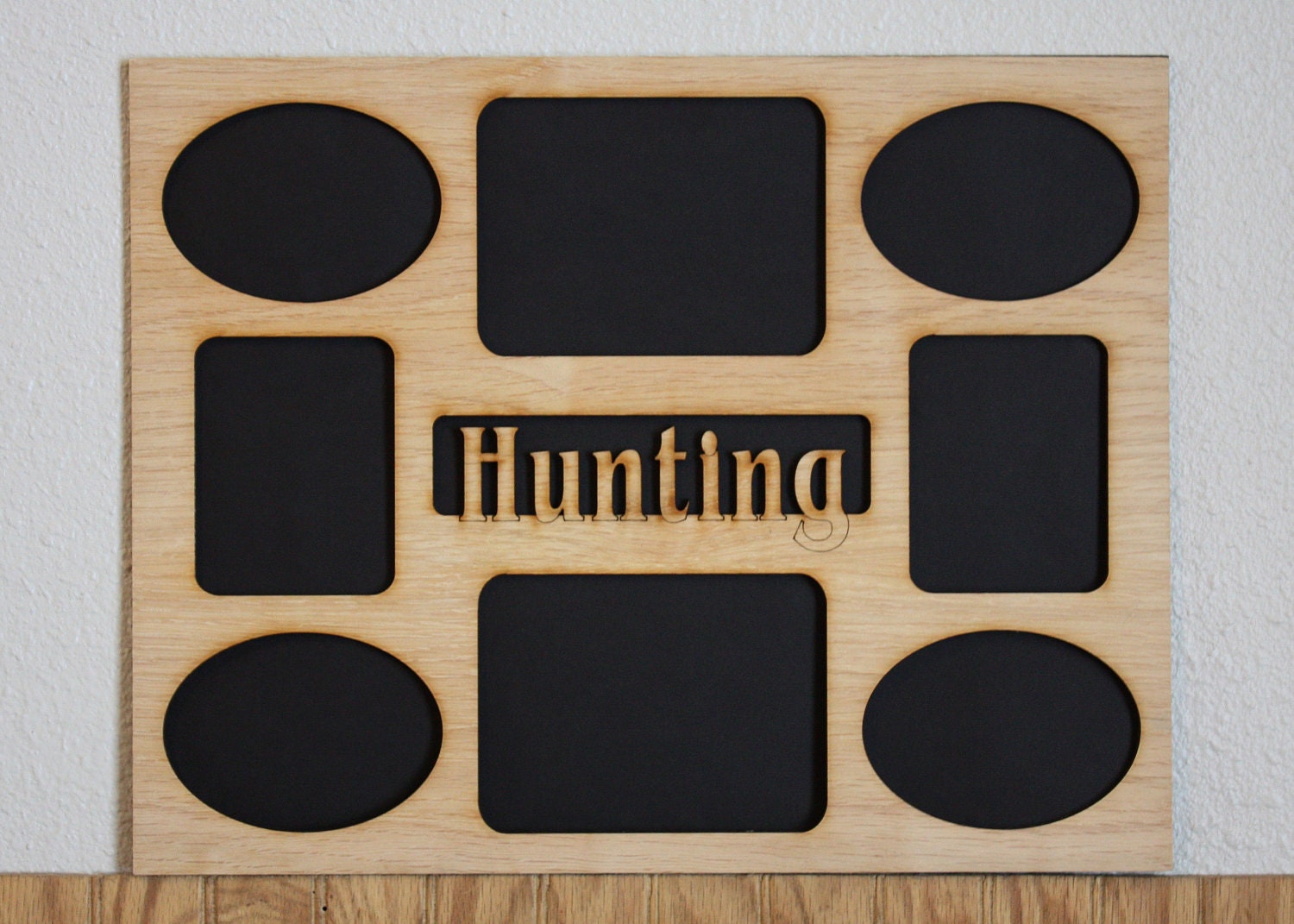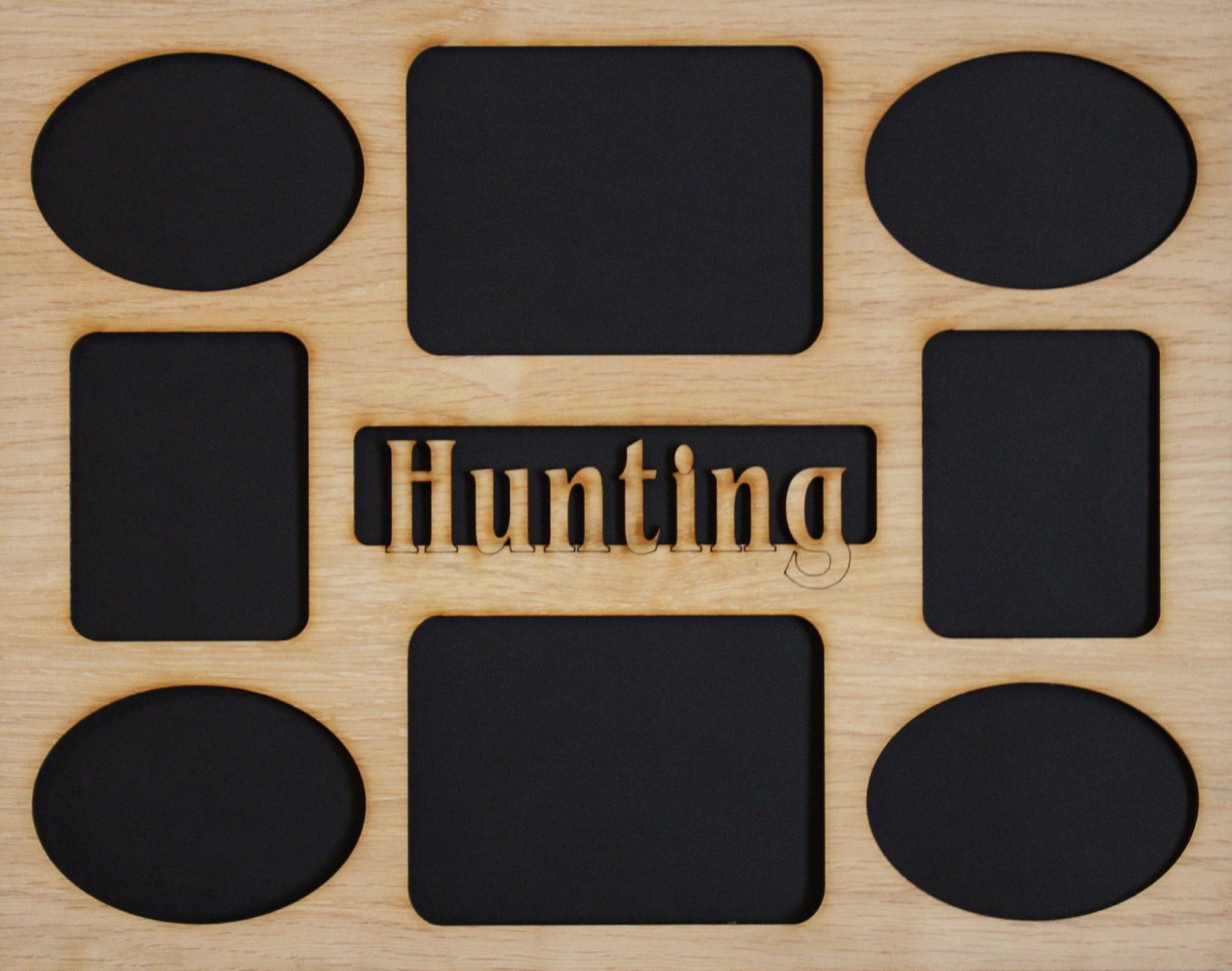 Slip this "Hunting" wood mat into an 11 x 14 frame and display 8 of your favorite hunting photos. This wood mat is an oak veneer and is cut with a laser. The sizes of the openings are (in inches): 4 – 3” (circles), 2 – 3” (squares), and 2 @ 3-5/8 x 5-3/4.