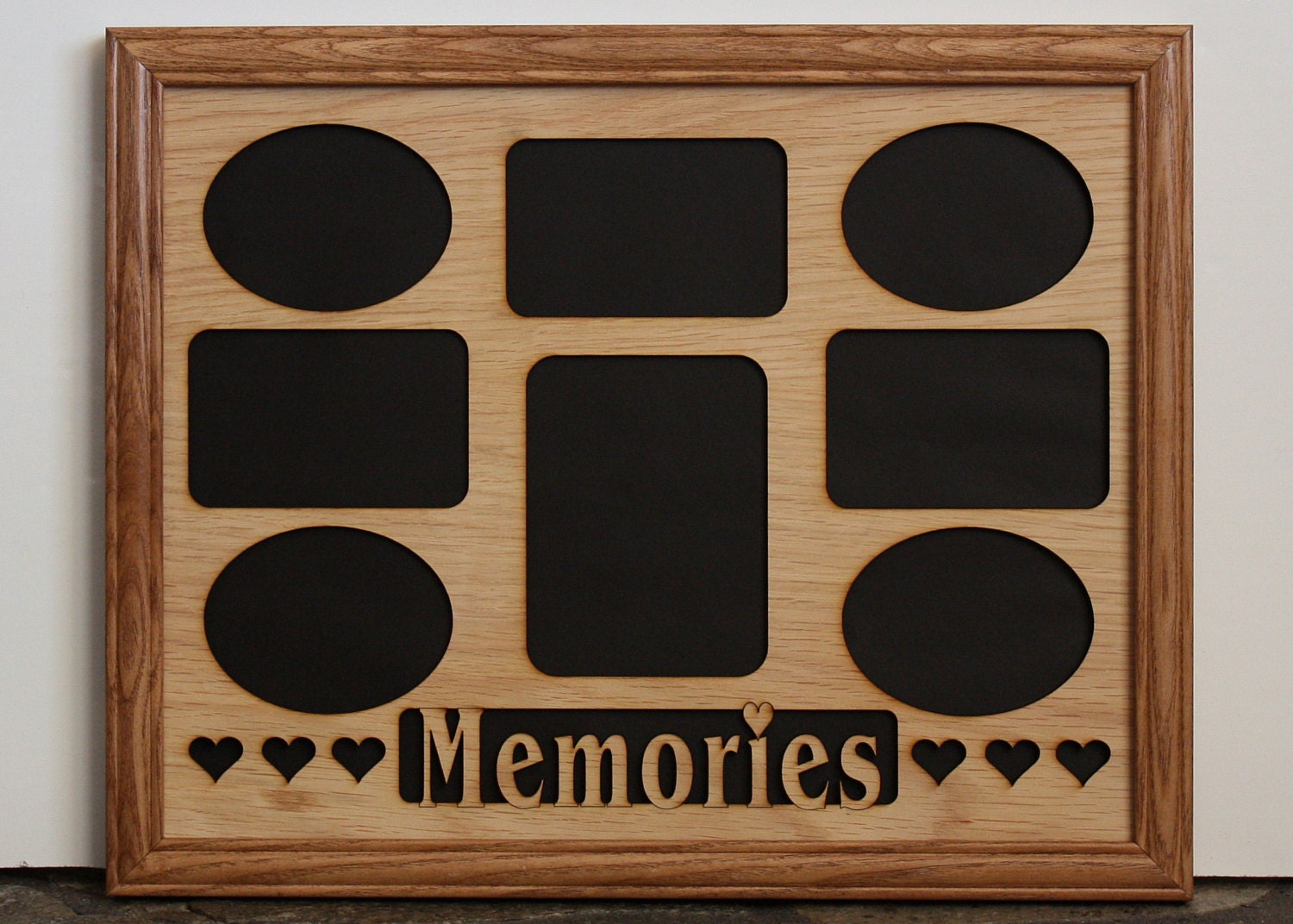 This mat can be used for any occasion, just slip it into an 11 x 14 frame and display 8 photos of your favorite memories. The wood mat is an oak veneer and is cut with a laser. The sizes of the openings are (in inches): 4 @ 2 5/8 x 3 ½, 3 @ 2 ½ x 4, and 1 @ 3 3/8 x 4 ½.