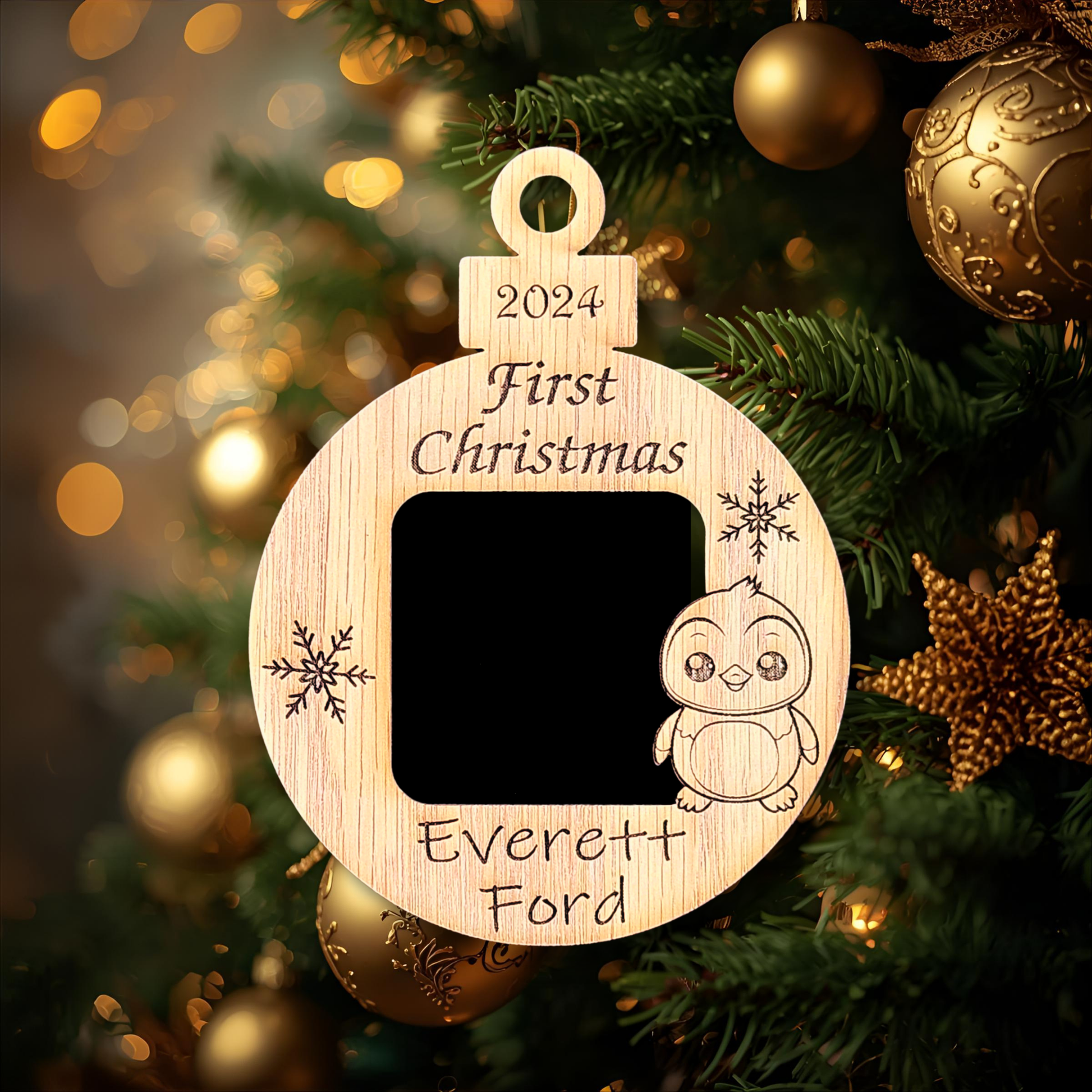 3" Baby’s First Christmas Ornament | Engraved Photo Frame | Personalized Name & Year Keepsake | Custom Wooden Penguin Holiday Gift