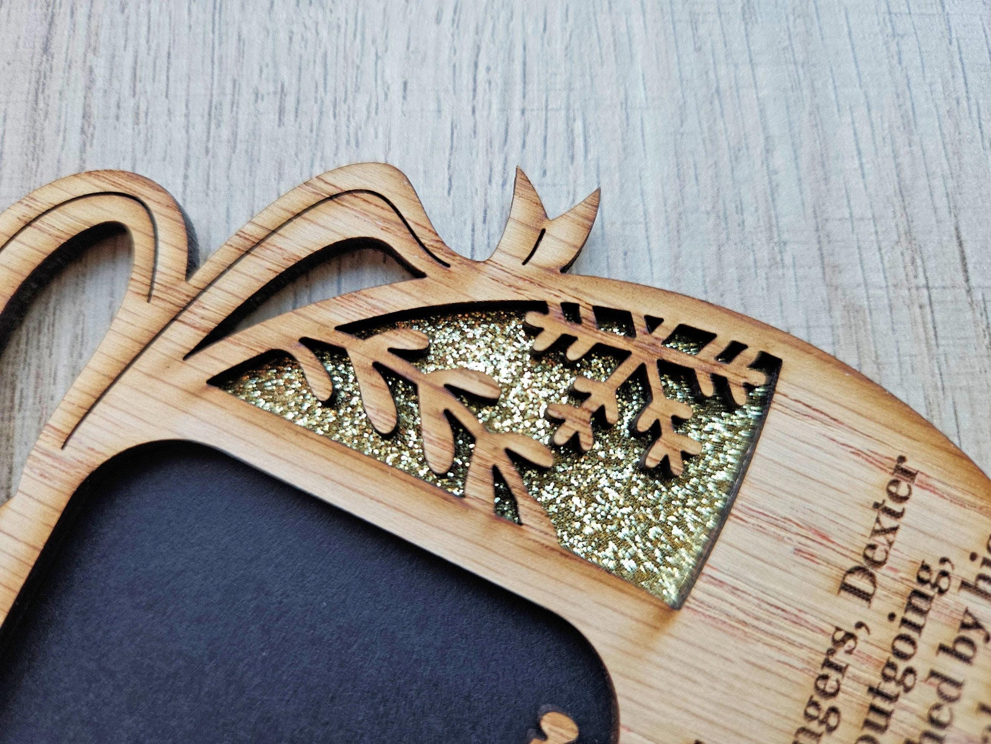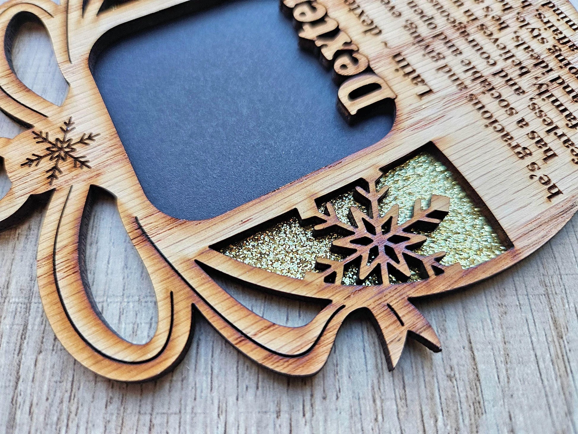 5" Christmas ornament with name meaning. Opening for photo is 2 x 2 inches. The ornament is 1/8" thick. The background glittery paper comes in purple, red, green, blue, and gold.