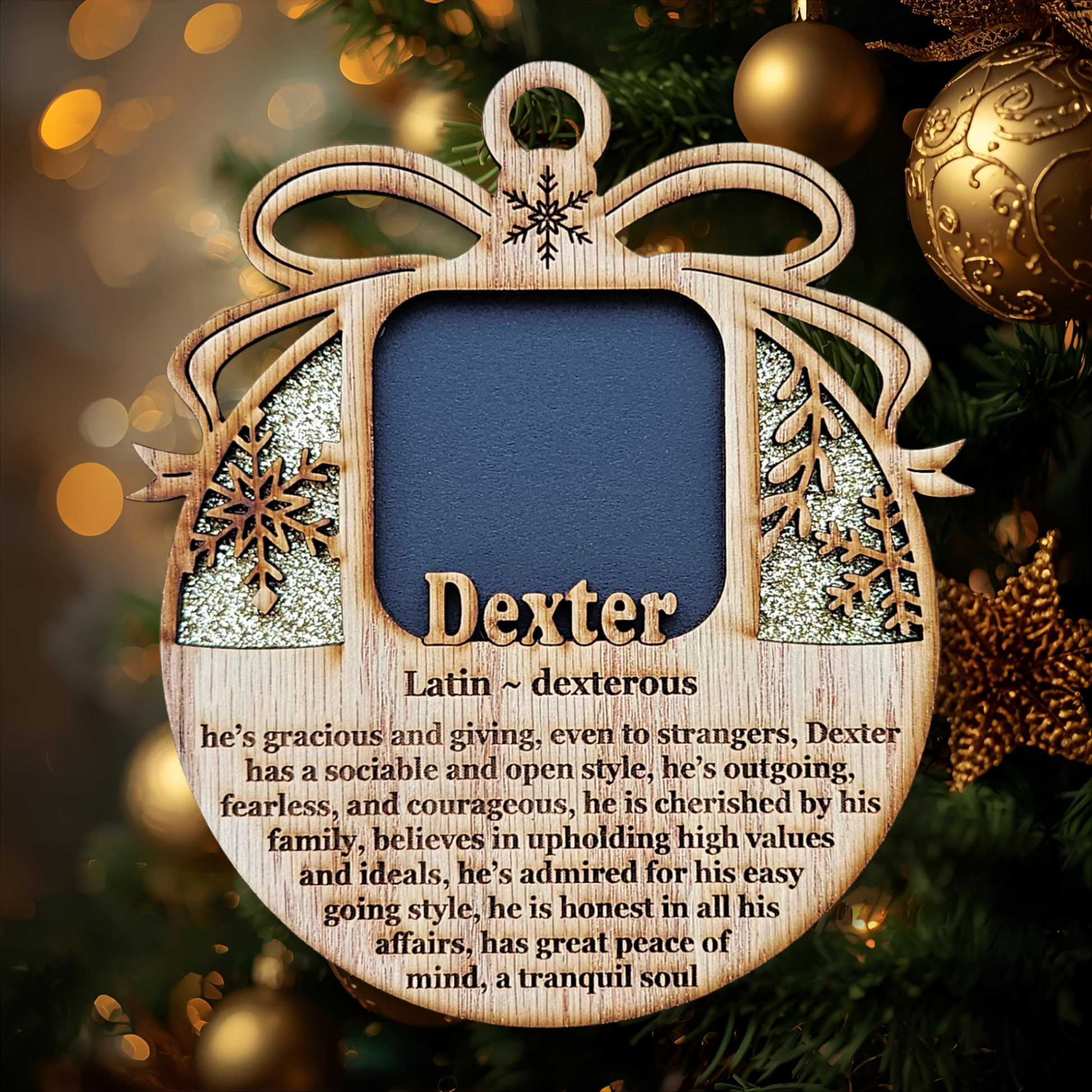 5" Name Meaning Christmas Ornament - Personalized Name Frame - 2x2 photo opening - Wallet Picture Frame Ornament - Grandparent Gift - Gold