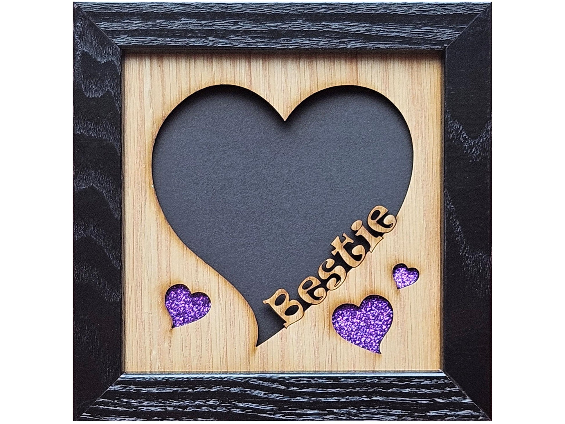 5x5 Bestie Picture Frame with 4x4 heart shaped photo opening. Cut down a 4x6 photo for this frame. Great gift for Valentines Day, weddings, anniversary, spouse, couples, best friends, and birthdays.