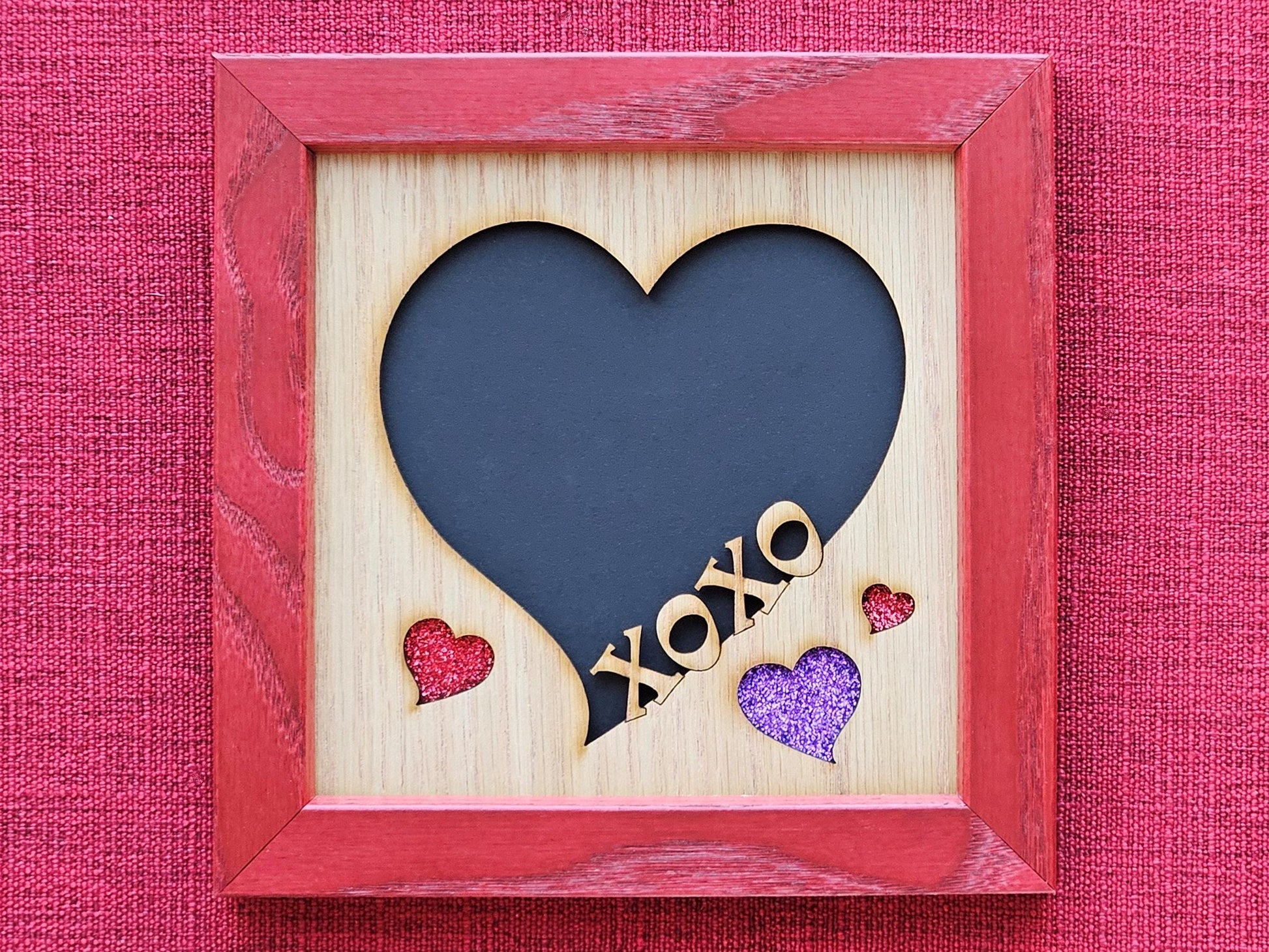 5x5 XOXO Picture Frame with 4x4 heart shaped photo opening. Cut down a 4x6 photo for this frame. Great gift for Valentines Day, weddings, anniversary, spouse, couples, best friends, and birthdays.